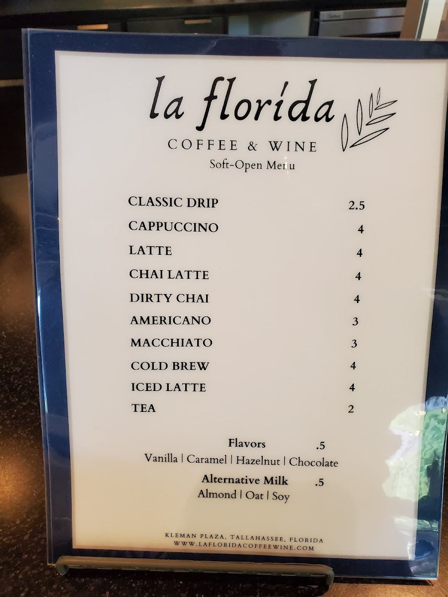 Welcome to La Florida Coffee & Wine, a delightful haven nestled in the heart of downtown Tallahassee at 350 S Duval St. This charming café is perfect for coffee aficionados and casual patrons alike, known for its welcoming atmosphere and vibrant decor. Customers rave about the friendly staff, making each visit feel like home.